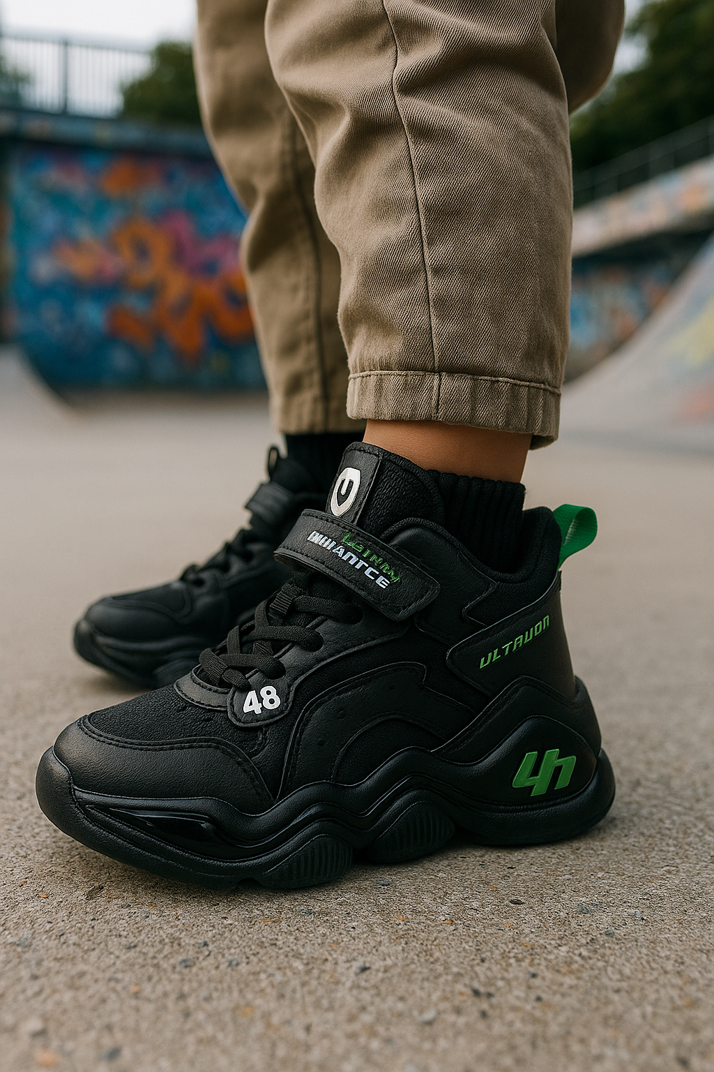 Su diseño completamente negro con detalles en verde neón crea un look poderoso, moderno y pensado para los niños y niñas que aman destacar sin esfuerzo.